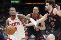Toronto Raptors forward Jamison Battle (77) pressures Houston Rockets guard Jalen Green (4) during first-half NBA basketball game action in Toronto, Sunday, Dec. 22, 2024. (Frank Gunn/The Canadian Press via AP)