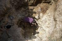 Juliet Samaniya, 6, chips at a rock with a stone tool at an illegal lithium mining site in Paseli, Nigeria, Tuesday, Nov 5, 2024. (AP Photo/Sunday Alamba)
