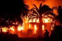 FILE - A firefighter watches as flames from the Mountain Fire consume a home in Camarillo, Calif., Nov. 6, 2024.