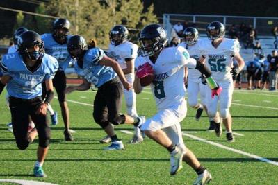 Crosspoint Christian's Chase Bacus finds some running room during a non-conference game at Chiloquin on Thursday, Sept. 22, 2022. Bacus rushed for 149 yards and two touchdowns on just eight carries and also made a 28-yard TD catch to lead the Warriors to a 50-22 victory in the Class 1A 8-man game.