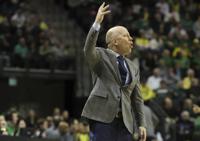 Oregon head coach Dana Altman, center, talks to players during the first half of an NCAA college basketball game against UCLA in Eugene, Ore., Sunday, Dec. 8, 2024.