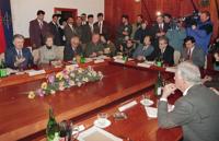 FILE - Former President Jimmy Carter, right, and Bosnian Serb leader Radovan Karadzic, left, speak during their meeting in the Bosnian Serb stronghold city of Pale, Bosnia, Dec. 19, 1994. After his previous successful missions in North Korea and Haiti, Carter is in former Yugoslavia to try and break the deadlock in Bosnia's peace talks. (AP Photo/Michel Euler, File)